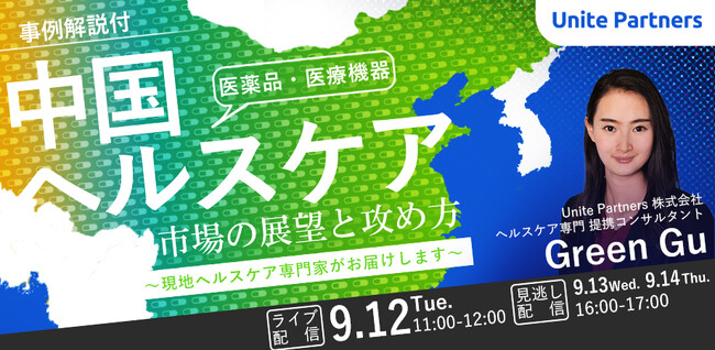 企業の変革パートナーを目指すブティック型コンサルティングファームのUnite Partners株式会社(本社:東京都、代表取締役:小林大輝)は、2023年9月12日(火)に「【事例解説付】中国ヘルスケア(医薬品・医療機器)市場の展望と攻め方 ~現地ヘルスケア専門家がお届けします~」と題してセミナーを開催します。