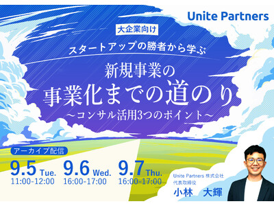 企業の変革パートナーを目指すブティック型コンサルティングファームのUnite Partners株式会社(本社:東京都、代表取締役:小林大輝)は、9/5(火), 6(水), 7(木)に、「スタートアップの勝者から学ぶ新規事業の事業化までの道のり ~ コンサル活用3つのポイント ~」と題して大企業で新規事業構築を検討している担当者・経営幹部の方向けのセミナーを開催します。