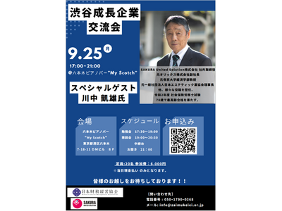 SAKURA United Solution株式会社、および一般社団法人 日本財務経営協会は、上場を目指す起業家と投資家・ベンチャーキャピタル、それを支援する士業が交流する場として、「渋谷成長企業交流会」を2023年9月25日(月)に六本木ピアノバー MY SCOTCHにて開催いたします。
