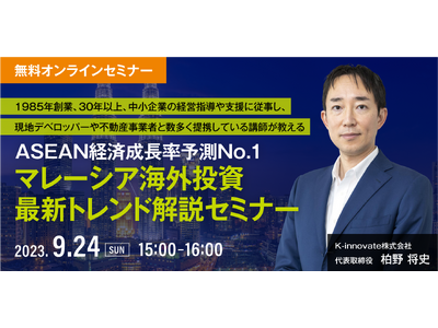 一般社団法人企業共創支援機構(所在地:東京都中央区 代表理事:小沼勢矢)は、2023年9月24日に1985年創業、30年以上、中小企業の経営指導や支援に従事し、現地デベロッパーや不動産 事業者と数多く提携している、K-innovate株式会社 代表取締役 柏野 将史 氏を講師にお迎えして、無料オンラインセミナーを開催!ASEAN経済成長率予測No.1 マレーシアの海外投資最新トレンドを解説していただきます。