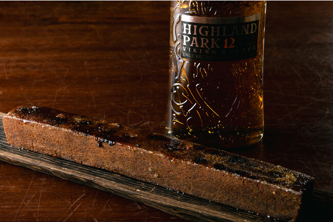 食後は、ウイスキーで香りをつけるスペシャリテのケーキ。『HIGHLAND PARK』の12年を使用。