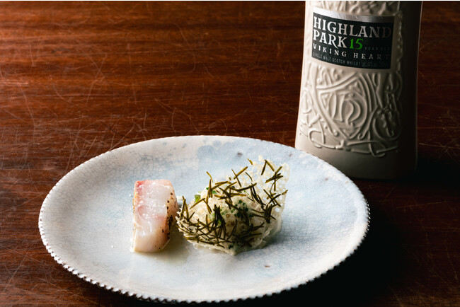 ヨーロピアンオーク・シェリー樽を使用した15年は、芳醇なヘザーハニーの香りが特徴。新鮮な鯛に薪の炎で炙った魚料理。引き締まった身にまとう、ほのかな燻香も楽しめる。