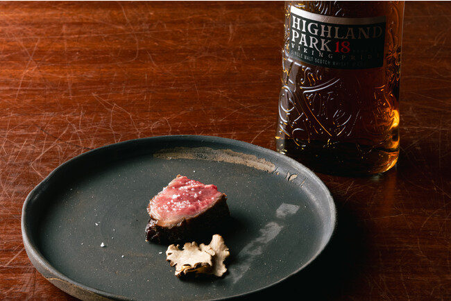 220年にわたる伝統製法を余すことなくつぎ込んだ18年。フルーツや花のような香りのなかに、スパイスを感じる味わい。合わせるのは、旨味が濃厚な経産牛。表面をクリスピーに焼き上げ、旨味を内部に凝縮。