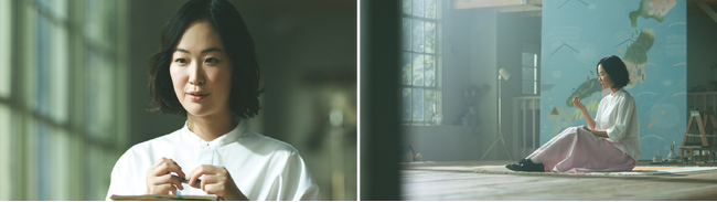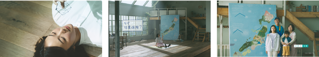 新CMは、「なぜ、地震保険に入るといいんだろう?」という黒木さんの自問自答から始まります。あたたかな木漏れ日が降り注ぐアトリエ空間。黒木さんの傍らには、日本地図が描かれた大きなキャンバス。その地図に重なるようにして、実際、過去に保険金を受給された方々から、それぞれの「暮らし」が地震保険によって守られたエピソードが語られます。そんな受給者の声を聞いた黒木さんが、地震などの大きな災害が発生した後にも一人ひとりの大切な暮らしがあるという当たり前のことや、「もしも」のとき、暮らしを守るために必要なものは何なのかという答えに気がつく、というストーリーとなっています。地震保険に対する漠然とした疑問から、「気づき」を得た瞬間まで、繊細に表現する黒木さんの表情の変化は必見です。