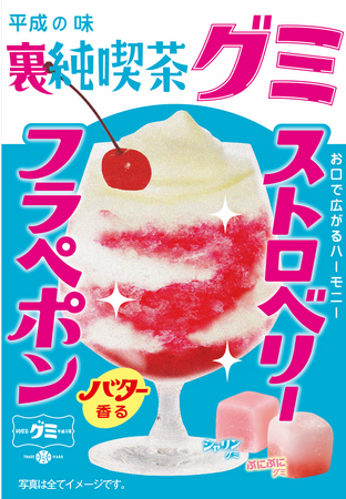 ストロベリーフラぺポンは「フラッペ=かき氷」をイメージした濃厚なイチゴ味にミルク感とバター風味をプラスした、食感の異なる2種のグミを一つの袋に閉じ込めました。