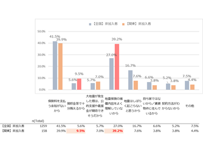 関東エリアでは、非加入者の地震保険に加入していない理由の傾向として、「地震保険の補償内容をよく理解していないから」が39.2%と全国平均(27.0%)に比べて非常に高い結果となりました。被災した際の対応については、「預貯金で賄う」と回答した方が39.2%と全国平均(28.2%)に比べて高い一方で、「特に考えていない」という回答が4割超と、多くの方が経済的な備えについて検討していない結果となりました。