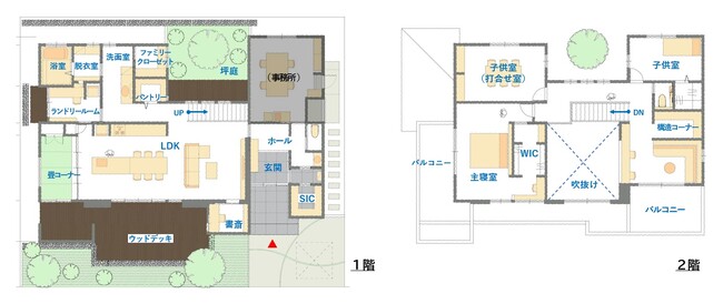 (1階)キッチン横の畳コーナーや、縁側のような佇まいの坪庭は、ほっとくつろげる癒しの空間です。