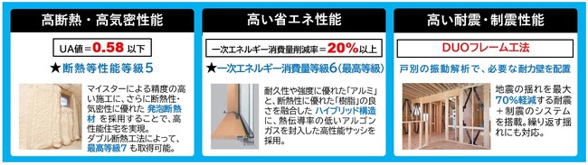 ZEH基準を超えた高断熱・高気密による住宅性能の向上で、空調効率の良い省エネ住宅を実現し、さらにエネルギーの自給自足に向けた太陽光発電システムや蓄電池の採用は、自然災害時にもご家族の生活を守ります。