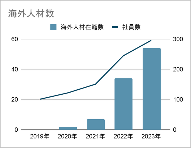 2020年に初めて海外人材2名が入社し、2021年に7名、2022年には34名と徐々に在籍数が増えてまいりました。
