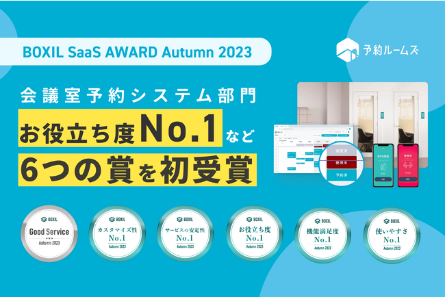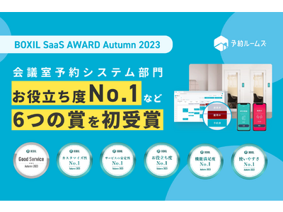 株式会社RECEPTIONIST(本社:東京都目黒区、代表:橋本真里子 以下、当社)が提供する会議室予約システム「予約ルームズ」は、スマートキャンプ株式会社(以下「スマートキャンプ」)が主催する「BOXIL SaaS AWARD Autumn 2023」の会議室予約システム部門で「Good Service」と、「サービスの安定性」「機能満足度」「カスタマイズ性」「お役立ち度」「使いやすさ」でそれぞれNo.1に初選出されました。