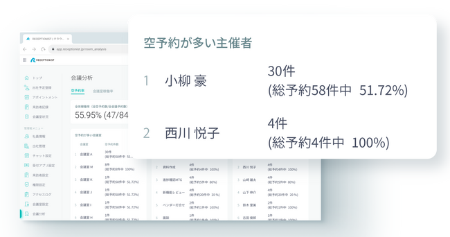 入室がない「空予約」を自動でキャンセルし解放する機能、予定より早く会議が終わった場合に残りの時間を「空室」として他の人が予約できる機能、クラウド受付システム「RECEPTIONIST」と連携し、次に同じ部屋を利用するゲストが受付に到着した際に来客を知らせて時間通りの退室を促す機能、そしてそれらの利用実績をログから分析できる機能を備えています。