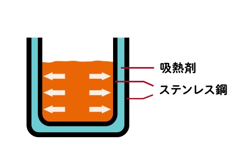 当製品は本体内側と外側に断熱効果の高いステンレスを使用し、そのステンレス2枚の間に、吸熱剤をいれることで熱湯を飲みやすい温度に下げることができます。保温のための蓋をなくし、熱を遮断する真空構造もなくすことで、温度をより下がりやすいようにしました。