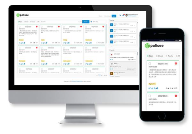 「polisee(R)(ポリシー)」は、今まではバラバラに点在しており一元化してモニタリングする事が難しかった、日本の法令改正に影響を与える省庁各部局/会議/有識者などの最新情報を、現役弁護士による25年以上のノウハウと最新テクノロジーで紐付けし「Policy-Making Lifecycle」として整理。さらにビジュアルに可視化、検索可能(特許取得済)としたSaaSプラットフォームです。また、日本語と英語で利用可能で、グローバル企業の世界中の各拠点を結び、情報共有、理解、戦略策定の最適化を図れます。