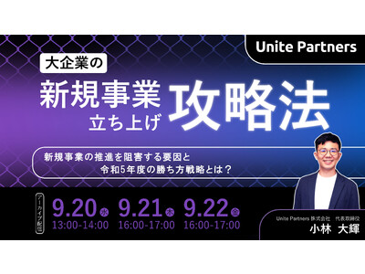 企業の変革パートナーを目指すブティック型コンサルティングファームのUnite Partners株式会社(本社:東京都、代表取締役:小林大輝)は、2023年9月20-22日に、「大企業の新規事業立ち上げ攻略法~新規事業の推進を阻害する要因と令和5年度の勝ち方戦略とは?~」と題して大企業の新規事業担当者向けのセミナーを開催します。(5月11日(木)開催セミナーのアーカイブ配信となります。)