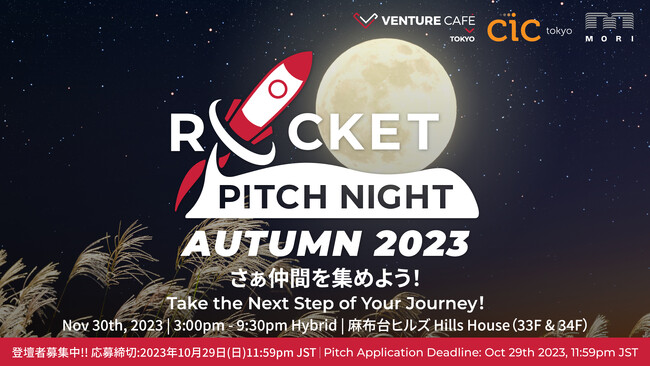 世界15都市に展開し、イノベーションを加速させる様々なプログラムを提供するグローバルなイノベーション・コミュニティであるVenture Cafe Tokyo(所在地:東京都港区、エグゼクティブ・ディレクター:山川 恭弘)は(東京都港区、会長:梅澤高明)、森ビル株式会社(東京都港区、代表取締役社長:辻 慎吾)と共催で「ROCKET PITCH NIGHT AUTUMN 2023」を2023年11月30日(木)に開催致します。本イベントは過去550組5,700名以上が参加し、累計100億以上の資金調達*、グローバルアクセラレーションプログラムへの採択、プロダクトの共同開発など様々な出会いとHAPPENに繋りました。(*公知情報に基づくVenture Cafe Tokyo調べ)