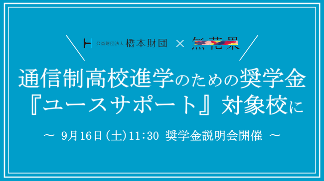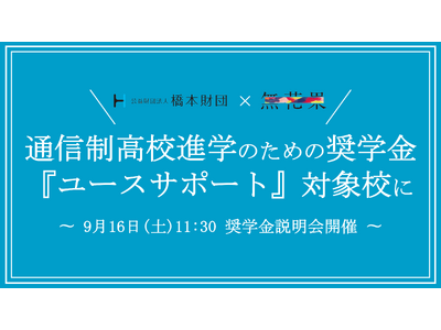 無花果株式会社(所在地:岡山県岡山市 代表取締役:中藤寛人、以下「当社」)が運営する無花果高等学園が、公益財団法人 橋本財団(所在地:岡山県岡山市 代表:理事長 橋本 俊明)が開始した通信制高校進学のための奨学金事業「ユースサポート」の対象校となりました。併せて、2023年9月16日(土)11時30分より、奨学金説明会を開催いたします。