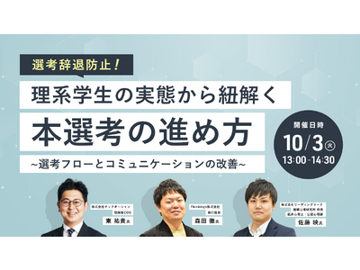 Personality Techを通じたHR事業「ミキワメ」を提供する株式会社リーディングマーク(本社:東京都港区、代表取締役社長:飯田 悠司、以下リーディングマーク)は、組織づくりのプラットフォーム「sonar HRテクノロジー」を展開するThinkings株式会社(本社:東京都中央区、代表取締役社長:吉田 崇)、理系新卒ダイレクトリクルーティングサービス「TECH OFFER(テックオファー)」を提供する株式会社テックオーシャン(本社:東京都文京区、代表取締役:長井 裕樹)と2023年10月3日(火)13:00~14:30にて、「新卒学生の選考辞退防止」にまつわるオンラインセミナーを開催します。