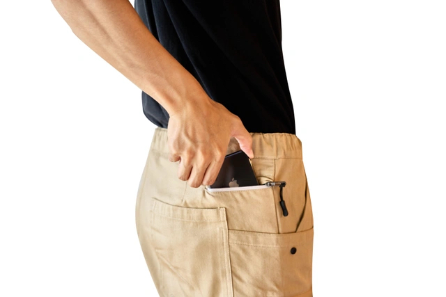 サイド部分に配置されたこのポケットは、特にスマートフォンの収納を考慮してデザインしました。普通のパンツでは背面や前部にポケットがあるため、座る際にスマートフォンが圧迫されやすくなってしまいます。しかし、この焚き火パンツのサイドポケットは、座った時でもスマートフォンが自然と身体の横に収まるため、圧迫感がなく収納することができます。