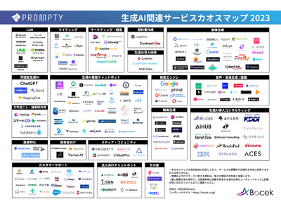 生成AIメディア「PROMPTY」を運営し、生成AIの導入をワンストップで提供する生成AI特化戦略コンサルティングファームである株式会社Bocek(本社:東京都大田区、代表:沖村 昂志)は、生成AI基盤チャットボットや画像生成AIなど、生成AIに関連する企業やサービスをカテゴリ別にまとめた「生成AI関連サービスカオスマップ 2023」を発表しました。