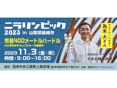 為末大さんがアンバサダーとして応援する「市民400メートルハードル」や、韮崎市の市名にちなんだ「ニラ」の造形バトンを繋ぐ「400メートルニレー」、陸上トラック1周で競う「大玉400メートルリレー」など、オリジナル競技をご用意します。