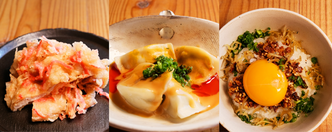 おすすめは「くれない豚ショウガ天」や「水餃子~ピリ辛ゴマダレ~」「サクサクTKG(揚げジャコ)」など。