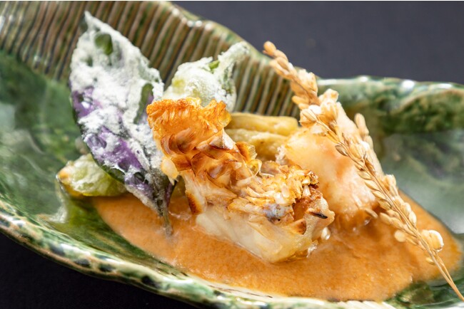 パリパリで香ばしく焼き上げた甘鯛の鱗、フワフワで甘みを感じる甘鯛の身。それを料理人たちが甘海老をすりつぶし、丁寧に旨味を取り出した海老味噌ソースでいただく手間暇をかけた一品です。
