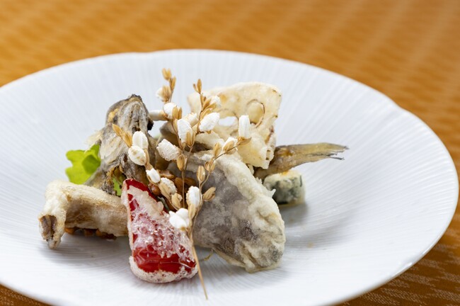 鯛一尾を丸々唐揚げにして調理した一品。身はフワフワの食感、噛むたびジュワッと凝縮された旨味が染み出ることが一押しの理由です。骨はカリカリに揚げて香ばしく、恵保鯛丸々すべてお楽しみいただけます。