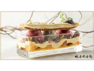 パフェグラスの中にみかんソースと芳しいほうじ茶ゼリー、白ワインでしっとり仕上げたりんごコンポート、コクのあるカスタードクリームを重ね、ナチュラルな秋色のカラーパレットに。サクサクとしたクランブルとカリッとキャラメリゼしたくるみ、渋皮栗はアクセント。自家製のほうじ茶アイスに隠し味のカシスソースをかけ、たっぷりと和栗のモンブランクリームを絞り仕上げました。
