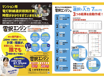 マンション関連の電気工事のパイオニアである三建電業株式会社(所在地:大阪府枚方市、代表取締役:吉田幸一)は、電気工事会社・設計事務所向けのアプリ「電択エンジン」を10月1日にリリースしました。これは、マンションの新築・リニューアル時の電灯幹線選択根拠の算出(※)を効率化し、信頼性の高い電気設計をサポートする革新的なソリューションです。