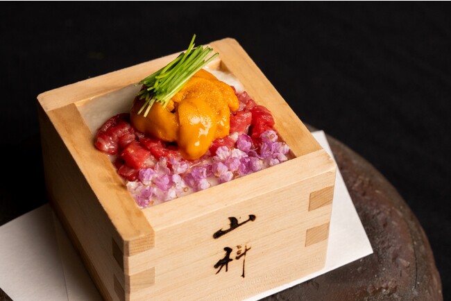 「銀座山科はなれ」は"鉄板焼き"の本店山科の奥にあり、提供する主たる牛肉は滋賀県のブランド牛「近江牛」。その中でも一般的に24ヵ月の肥育で出荷される牛を、生産者と一緒になって手間暇かけ、40ヵ月以上じっくり育てる”超長期肥育”することで生体熟成(=生きた状態で熟成)させた「完熟近江牛」を、鉄板焼きと食材共有することで焼肉でも提供できるようにしました。旨味が強く、キレのある脂が特徴の特別な焼肉をお楽しみいただけます。