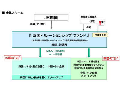 日本プライベートエクイティ株式会社(本社:東京都千代田区、代表取締役社長:法田真一、以下「JPE」)は、四国旅客鉄道株式会社(本社:香川県高松市、代表取締役社長:西牧世博。以下「JR四国」)と共同で、JR四国の経営基盤強化と四国の地域経済発展への寄与を目的として、JR四国が全額出資するプライベートエクイティファンド 「JR四国・リレーションシップ1号投資事業有限責任組合」(以下、「四国・リレーションシップファンド」)を総額20億円で設立しました。