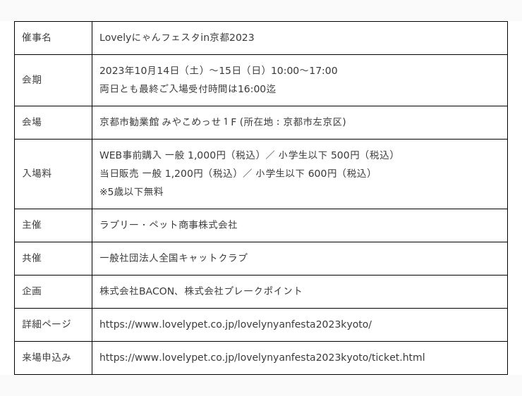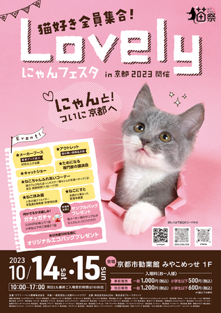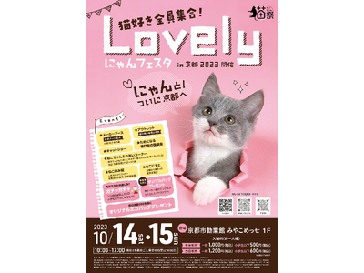 ペットフードやペット用品等の総合卸商社であるラブリー・ペット商事が主催で行う、『猫好きの・猫好きによる・猫好きのためのイベント』で、2023年10月14日(土)~15日(日)に京都市勧業館 みやこめっせ1F (所在地:京都市左京区) にて開催。