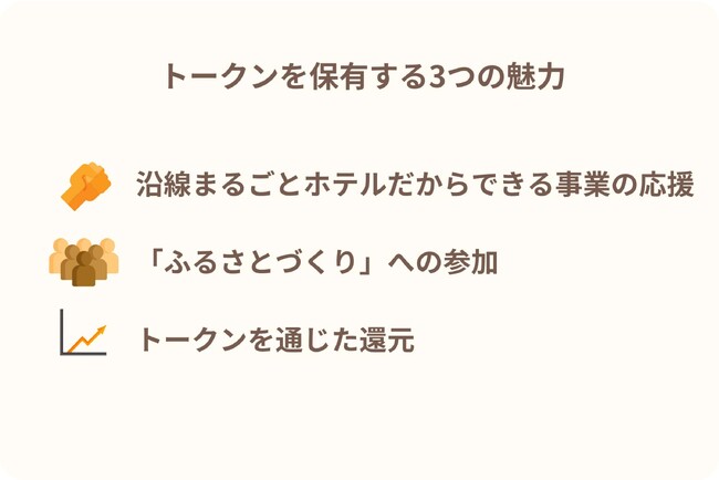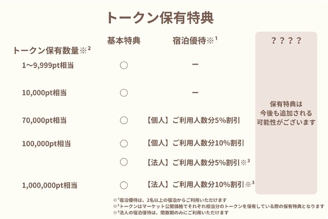 サポーターの皆さまが、本ファンディング、そしてその後(マーケットオープン後)でのトークン売買によって得たトークンを保有することで獲得できる特典となります。
