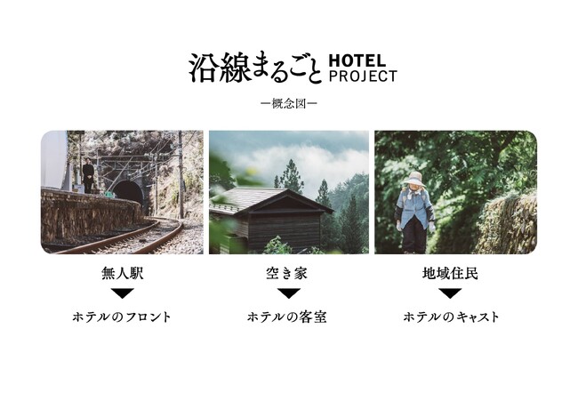 無人駅の駅舎等を改修して「ホテルのフロント」として活用することや、沿線集落の空き家を「ホテルの客室」に改修して地域住民と共に運営を行うこと等を通じて、その土地にあるモノ・コト・ヒトの「豊かな情緒」にふれてもらい、「ふるさと」を感じる滞在体験を創出していくことを目指しています。