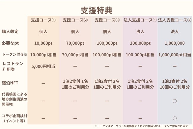また、今回は「個人向け」と「法人向け」に支援コースをご用意しておりまして、購入ポイントに応じて獲得できる特典が変わってきます。以下の支援特典およびトークン保有特典一覧をご確認のうえ、支援コースのご購入をお願い致します。