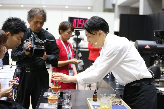 「Japan Barista Championship(JBC)」はバリスタチャンピオンシップの世界大会「World Barista Championship(WBC)」のルールに則って競技し、決勝の舞台に立つのは全国から予選と準決勝を勝ち上がった6名。アジア最大級のスペシャルティコーヒーイベント「SCAJ」内ステージで行われ、立ち見も出る満員の盛況のもと、熱戦を繰り広げました。SCAJは世界中からコーヒー業界関係者らが集う展示会で、主催者発表によれば会期中約7万人が会場の東京ビッグサイトへ足を運びました(※4日間来場者数合計69,201名)。
