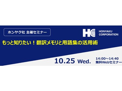 「産業分野に特化した翻訳・機械翻訳サービスを展開する株式会社ホンヤク社(代表取締役:原田真)は、『もっと知りたい!翻訳メモリと用語集の活用術』と題した無料Webセミナーを2023年10月23日(水)に開催します。」