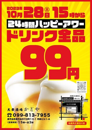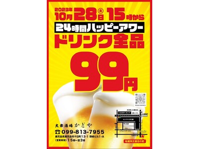 株式会社WR(本社:鹿児島県鹿児島市 代表:石川瑛祐)が運営する『大衆酒場かどや』では、2023年10月28日(土)15:00~10月29日(日)15:00まで24時間営業を実施するとともに、「ハッピーアワーで天文館を元気に」をテーマにしたイベント、【24時間スーパーハッピーアワー】を開催します。