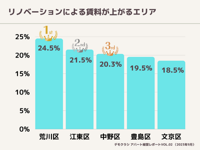1位の荒川区は24.5%(リノベ前の新築比較賃料69.45%、リノベ後の新築比較賃料93.94%)、