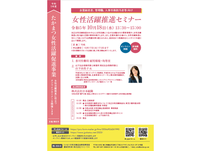 10月18日(水)13:30より香川県高松市の主催で開催される「令和5年度たかまつ女性活躍促進事業 女性活躍推進セミナー」において、女性活躍推進の成功事例の発表企業として株式会社日本総険が参画させていただきます。