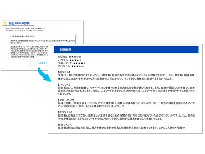 本機能を使うことで、自己PRで人事が評価するポイントはどこか、より魅力的に自身のエピソードを伝えるにはどう改善すべきかが4つの評価軸(ロジカル・パワフル・グローアップ・オリジナル)でわかり、改善に役立てることができます。