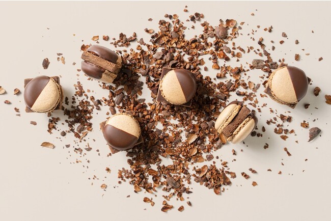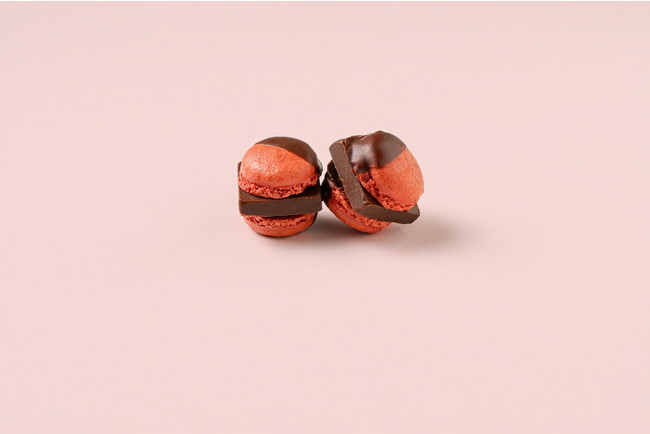 マカロンとチョコレートが織りなす複雑で深みのある味わいや香りを楽しんでいただくため、一粒の大きさを小ぶりにし、さらにカカオの香りがストレートに伝わる80%のチョコレートを上掛けしております。