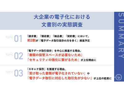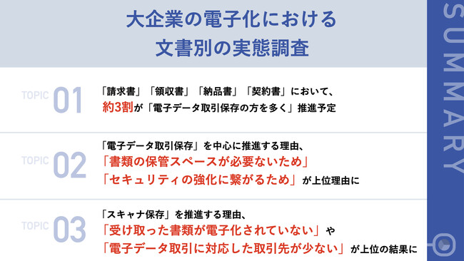 大企業においても電子化の波は加速している中で、未だに紙書類が多く「スキャナ保存」を取り入れている企業が多い背景には、取引先の電子化状況に左右されていることが明らかとなりました。「スキャナ保存」は、物理的な書類保管場所の確保や人的ミスによる書類の紛失などのリスクもつきまとうため、特に請求書や契約書など、セキュリティを重視する書類に関しては、「電子データ取引保存」への移行が最適ではないでしょうか。取引先企業に対しても、まずは電子化された「請求書」の送付によって、電子化していく企業のスタンスを示すことが、受け取る企業側の電子化切り替えのきっかけにもなりそうです。