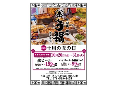 2023年4月オープン以来、連日満席の【う福三宮 さんちか味ののれん街】(運営:株式会社シーズン2、本社:東京都渋谷区)は、オープン6ヶ月を祝し、秋の土用の丑の日に合わせてお得な特典を開催します。
