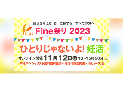 不妊治療患者をはじめ不妊・不育で悩む人をサポートするセルフサポートグループ「NPO法人Fine(ファイン)」は、2023年11月12日(日)にZoomによるオンラインにて、妊活に関するイベント『Fine祭り2023 ひとりじゃないよ!妊活』を開催します。