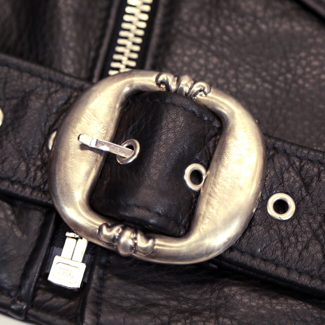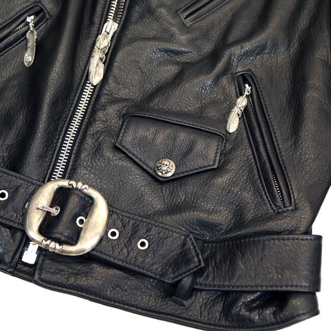 ジップにTMTオリジナルのフェザートップ、ボタン、バックルがカスタムされたTMT×Schottだけのオリジナルジャケット。
