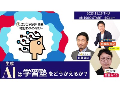 学習塾と教育サービスをつなぐ一括資料請求サイト「エデュマッチ」(共同代表:佐藤 雄太・田口 健吾)は、生徒の思考プロセス可視化ツール「NANDE」の日本e-Learning大賞「経済産業大臣賞」の受賞を記念し、11月16日(木)学習塾向けセミナー「AI×教育の未来・新時代の塾教育! 生成AIは学習塾をどう変えるか」を開催します。