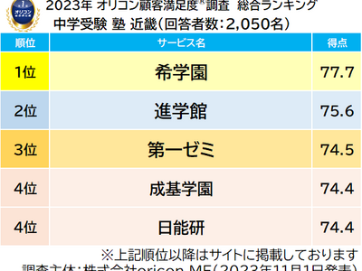 実際のサービス利用者を対象に第三者の立場で顧客満足度調査を実施する株式会社oricon ME(本社:東京都港区 代表取締役社長:小池 恒 略称:オリコン)は、『中学受験』を目的とした塾についての満足度調査を実施し、2023年11月1日(水)14時にその結果を「オリコン顧客満足度(R)」公式サイト内( https://life.oricon.co.jp/ )にて発表いたしました。