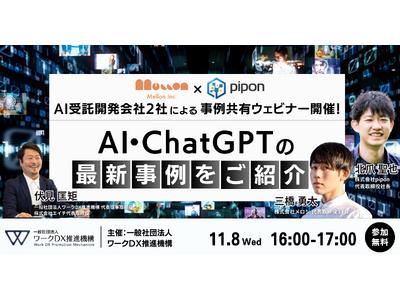 データサイエンス領域で受託開発やCTO派遣等を展開する株式会社メロン(本社:東京都 代表取締役:三橋勇太 以下、当社)は、株式会社piponとの共にAI・ChatGPTの最新事例をご紹介するウェビナーを開催します。