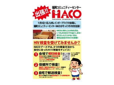 ・『保健所で検査!』における「即日特例検査案内」は福岡コミュニティセンターHACOが、福岡市と福岡県の世界エイズデー啓発事業の一環としておこなうものです。